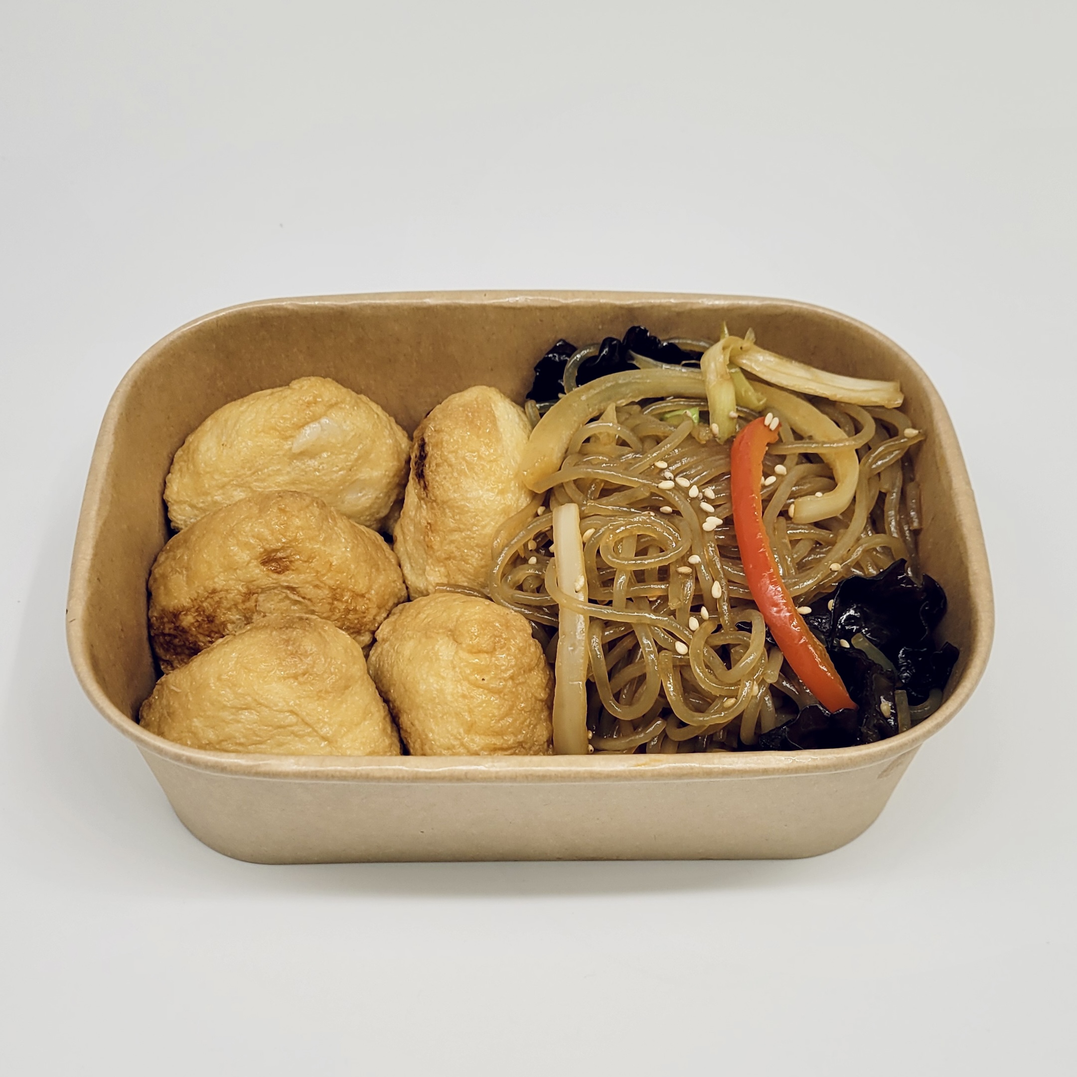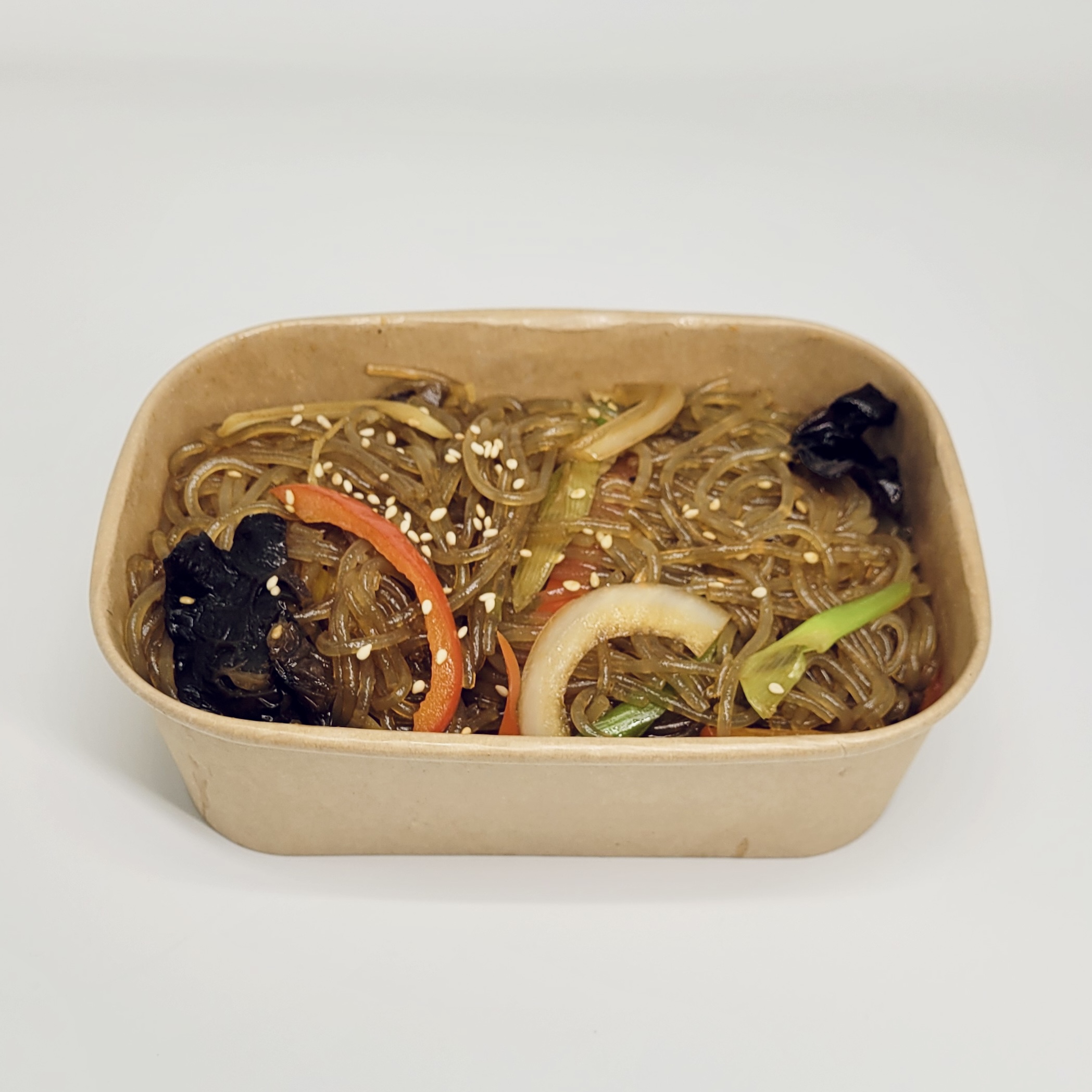 Glass noodles stir-fried with vegetables in a soy-based sauce. The noodles are slightly chewy, and the dish is naturally sweet and savoury.