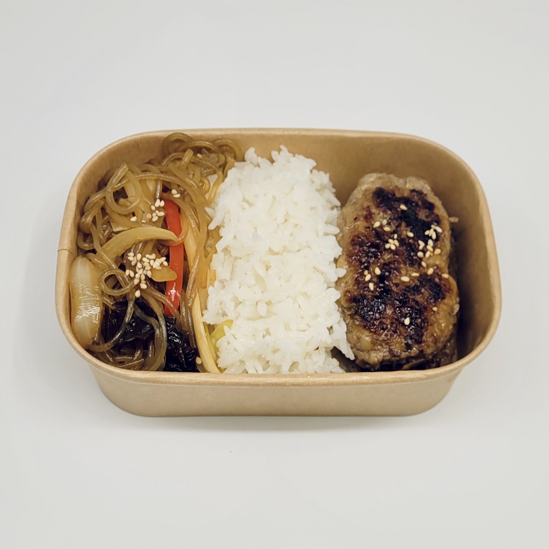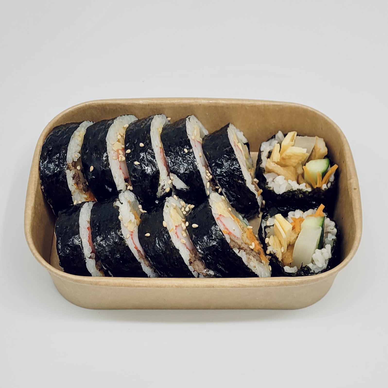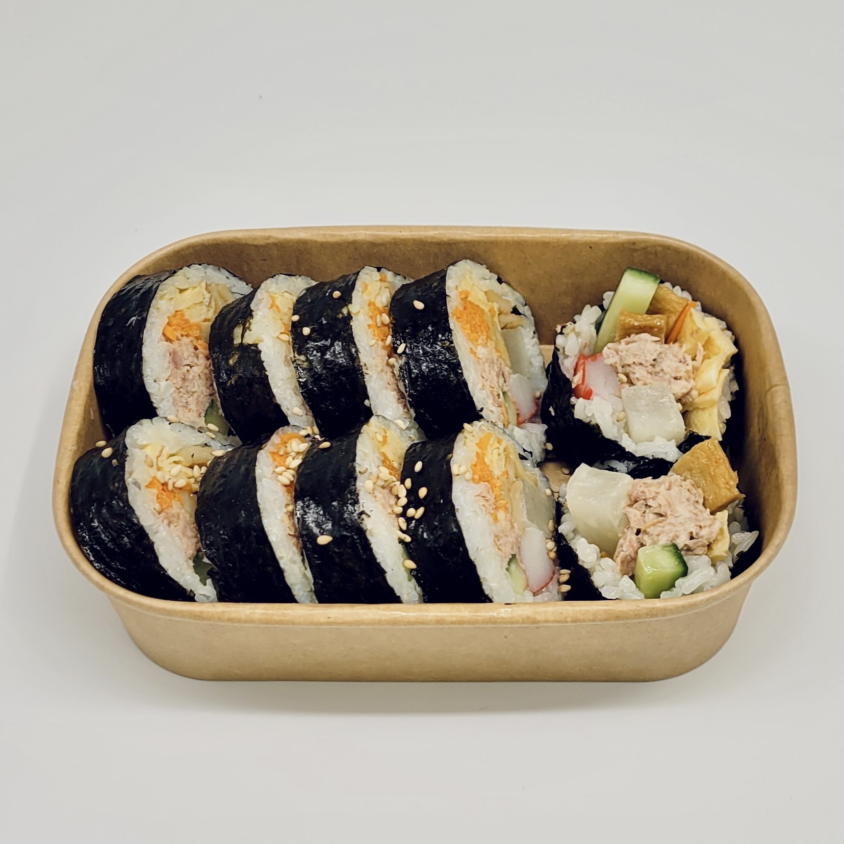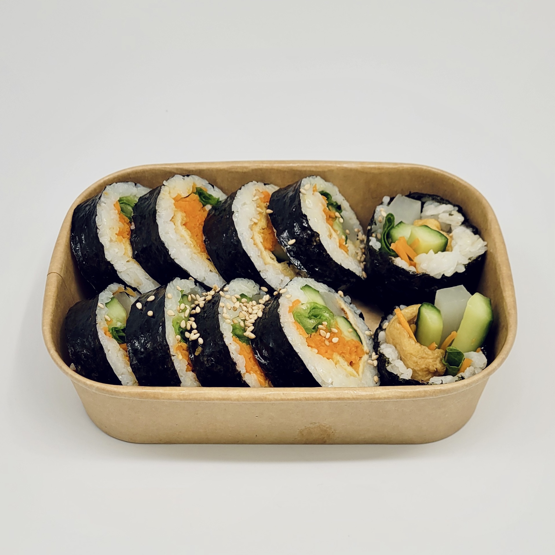 A popular Korean dish made of rice and various ingredients like vegetables, egg, fish cakes, and meat, all rolled in seaweed and sliced into bite-sized pieces. It has distinct but balanced flavours, seasoned with sesame oil.